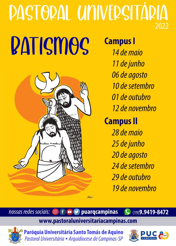 Batismos 2022 (calendário) Publicado por Pastoral Universitaria Campinas em 22 de fevereiro de 2022 Para mais informações, entre em contato com a secretaria paroquial: fone: (19)3343-7184 e-mail: pastoral@puc-campinas.edu.br Compartilhe isso: Clique para compartilhar no X(abre em nova janela) 18+ Clique para compartilhar no Facebook(abre em nova janela) Facebook Curtir Carregando... Relacionado